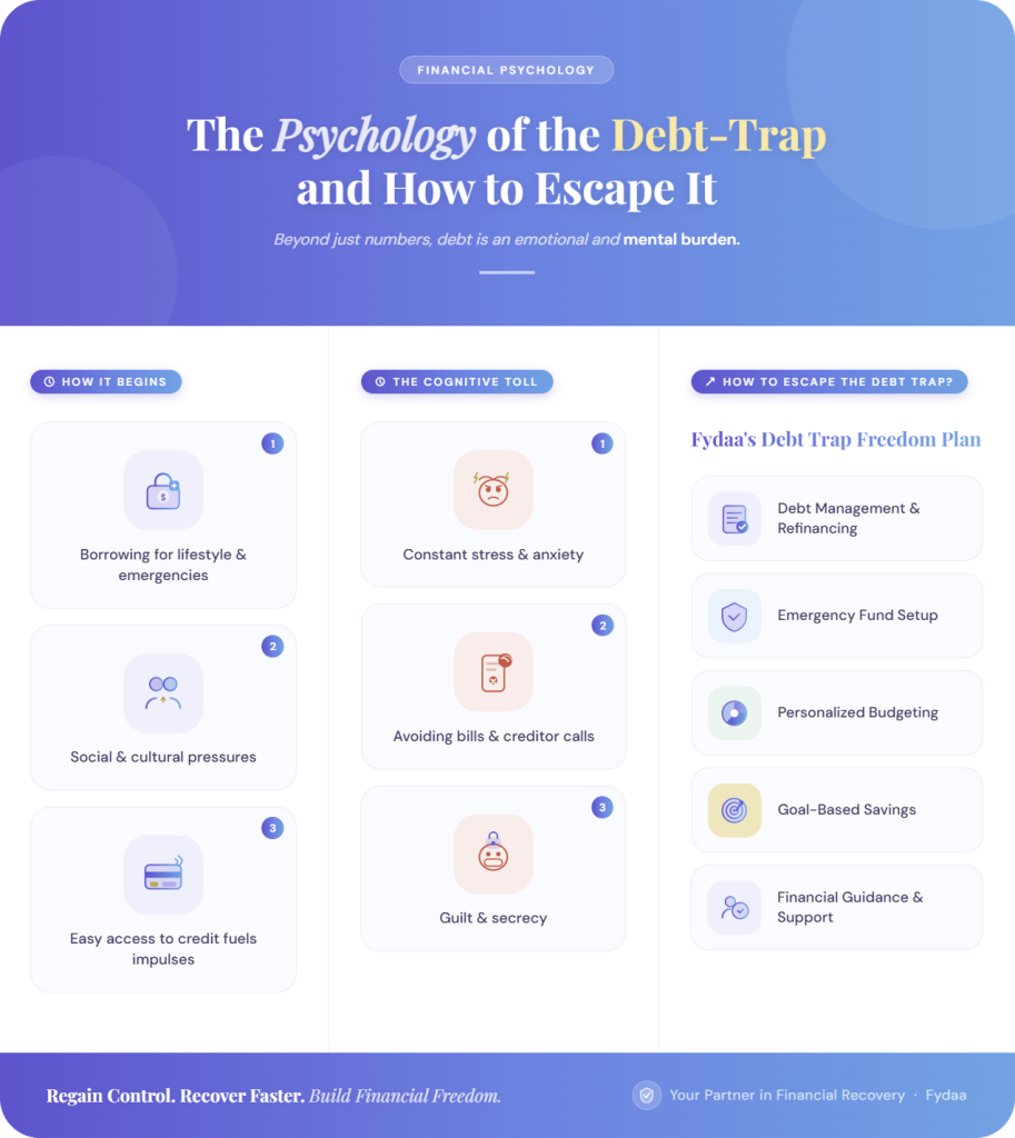 At Fydaa, the Debt Trap Freedom Plan is designed to address these challenges through personalized and practical guidance. It supports individuals with structured debt management and refinancing solutions, helps set up and maintain an emergency fund, and creates customized budgeting frameworks tailored to their income and lifestyle. Alongside this, the plan encourages goal-based and disciplined savings habits, ensuring that financial decisions are aligned with long-term needs rather than short-term pressure. By combining financial structure with behavioral awareness, the program empowers individuals not only to escape existing debt traps but also to build resilience against falling into them again.